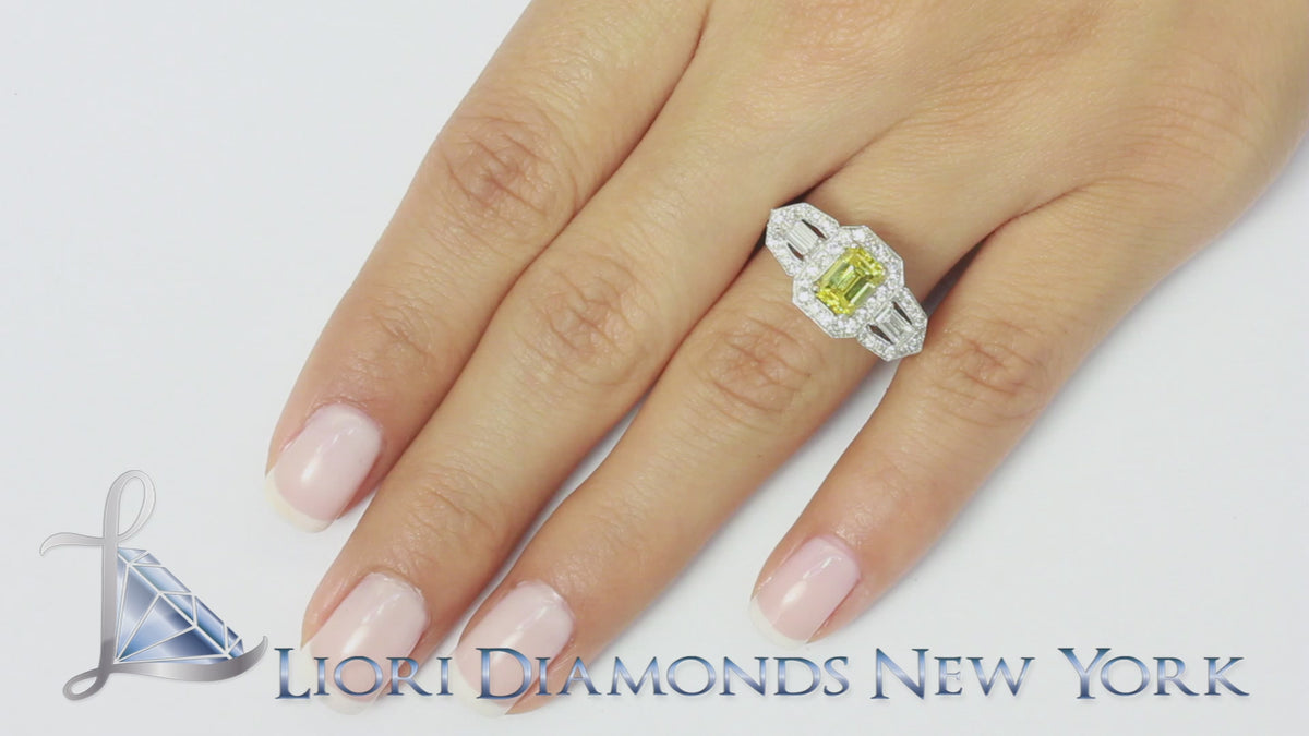 This custom diamond engagement ring is set up perfectly with a 1.02 ctw fancy intense yellow emerald cut center diamonds. Accompanying this gorgeous yellow diamond are 1.42 ctw of round brilliant and baguette cut F-VS white side diamonds. Two baguette diamonds set horizontally on the top of the ring, one baguette on either side of the fancy yellow center diamond. The round brilliant diamonds are all set in a micro pave setting around the face of the ring in a vintage style design. This fancy color diamond engagement ring is made in 14k white gold.