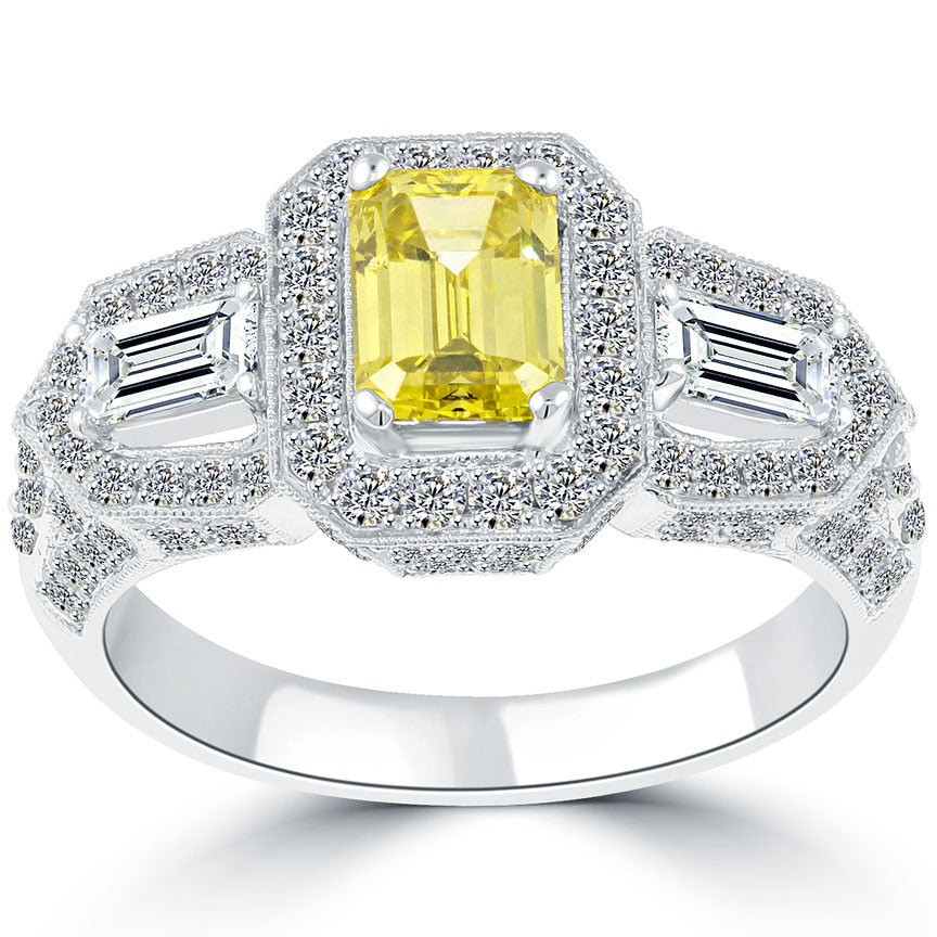 2.44 Carat Fancy Yellow Emerald Cut Diamond Engagement Ring 14k Gold Pave Halo
