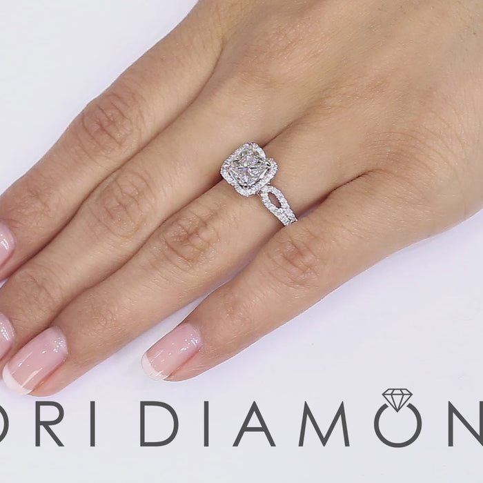 This vintage style princess cut engagement ring is truly exquisite. A sensational 1.90 ctw princess cut diamond sparkles from the center of this antique inspired setting. The center diamond is G-SI1 in color and clarity, and is guarded by 4 securing prongs. Glittery micro pave round diamonds surround the main stone, and extend onto the stylish split shank band. All of the side diamonds total 0.65 ctw, and are F-VS in color and clarity, providing constant brilliance. Gorgeously crafted in 18k white gold, this diamond engagement ring will surely impress!