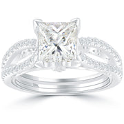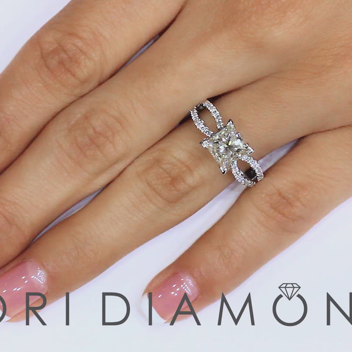 Propose with style and class when you present your future bride-to-be with this stunning engagement ring. A superb 2.03 ctw princess cut diamond radiates from the center. It is J color, VS1 in clarity, and is secured by 4 strong prongs. 0.45 ctw of glittery micro pave set diamonds decorate the elegant split shank band. This graceful vintage inspired setting is cast in 18k white gold.