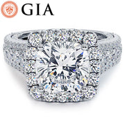 A vintage style micropavé halo graduated shank engagement ring set with 2.50 Carat Cushion Cut Lab Grown Diamond.