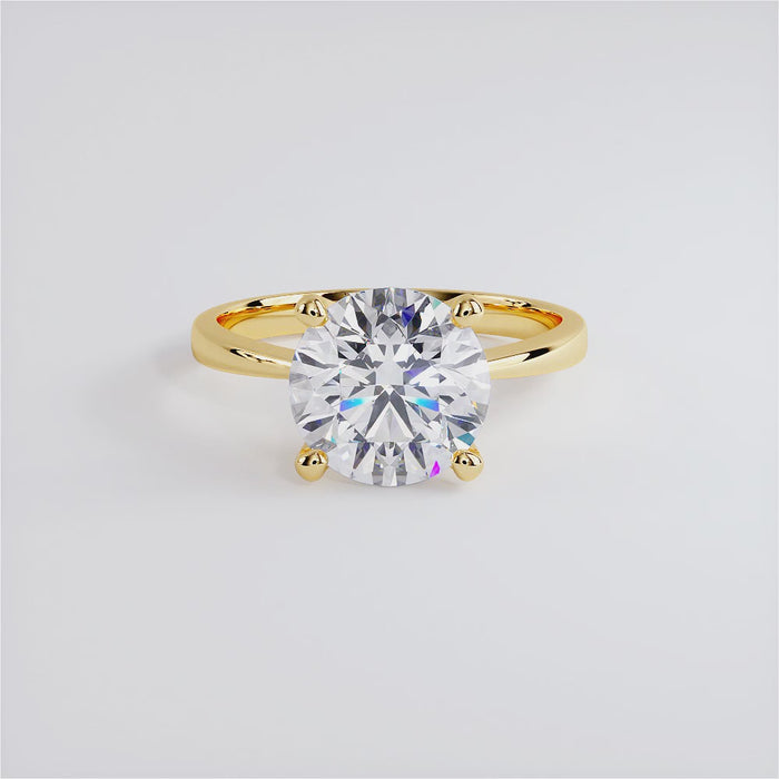 A petite tapered 4 prong solitaire engagement ring set with 2.50 Carat Round Cut Lab Grown Diamond.