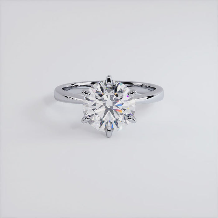 A petite tapered 6 prong solitaire engagement ring set with 2.50 Carat Round Cut Lab Grown Diamond.