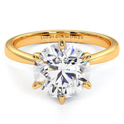 A petite tapered 6 prong solitaire engagement ring set with 2.50 Carat Round Cut Lab Grown Diamond.