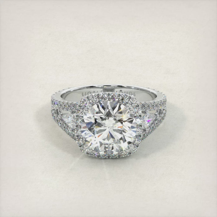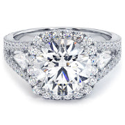 A three stone micropavé split shank diamond engagement ring set with 2.50ct dew Round Cut VVS & Colorless (D-E-F) Moissanite.