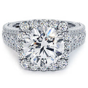 A vintage style micropavé halo graduated shank engagement ring set with 2.50ct dew Round Cut VVS & Colorless (D-E-F) Moissanite.