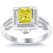 2.50 Carat Fancy Yellow Cushion Cut Diamond Engagement Ring 18k Gold Pave Halo