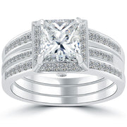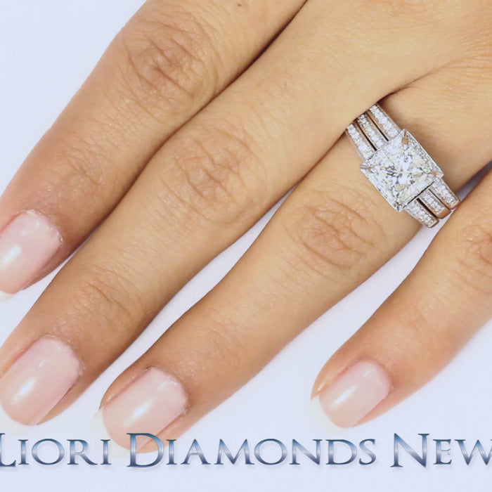 This classy Ladies Diamond Engagement Ring accommodates a 2.01ctw Princess Cut center diamond that is accompanied by 0.55ctw of F-VS round brilliant side diamonds. One row of round diamonds are set all around the princess cut center diamond, in a pave halo design. Three more rows of round diamonds are set on either side of the band, going slightly less than half way down the ring. This Princess Cut Diamond Engagement Ring is made in 18kt White Gold.
