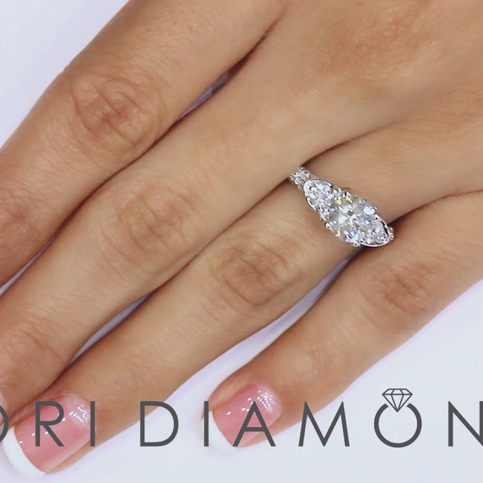 Show your love by proposing with this timeless 3 stone diamond engagement ring. A gracious 1.40 ctw round brilliant diamond of F-SI2 color and clarity is accompanied by 2 smaller round diamonds set slightly lower. All 3 main diamonds are in a prong setting. An abundance of enchanting micro pave set diamonds line the band and prongs. The glittery side diamonds are F in color, VS in clarity, and total 1.20 ctw. This awesome diamond engagement ring has been crafted beautifully in 14k white gold.