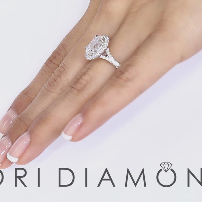 Here is a diamond engagement ring that is the ultimate in vintage elegance. A stunning 2.02 oval diamond mesmerizes from the center. This incredible center diamond is D in color (which is colorless), SI1 in clarity, and is held securely in place by 4 sturdy prongs. 0.68 ctw of micro pave set round diamonds create a sparkling halo around the oval diamond and travel onto the gorgeous semi split shank band. All of the shining side diamonds in this piece are F-VS in color and clarity. This oval diamond engagement ring is beautifully crafted in 18k white gold, and is sure to be a gift that will held close to the heart forever.