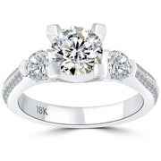 This glamorous three stone diamond engagement is set with three gorgeous round brilliant main stones. The center stone is an F-SI1 1.36ctw round brilliant diamond. All three main diamonds are set in a prong setting, the center diamond raised higher than the others. Smaller round brilliant diamonds are set in a micro pave setting on both surfaces of the ring and along either side of the band. This three stone diamond engagement ring is made in 18k white gold