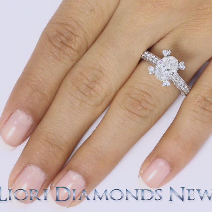 This unique diamond engagement ring is set with a beautiful 1.50ctw oval cut center diamond and is accompanied by 1.22ctw of beautiful F-VS round brilliant side diamonds. The oval cut center diamond is secured by four heart shaped prongs. The round brilliant side diamonds are set elegantly throughout the along the band and surfaces of this ring is a micro pave setting. This vintage style diamond engagement ring sparkles from every angle you look at it and is made in 14kt white gold.