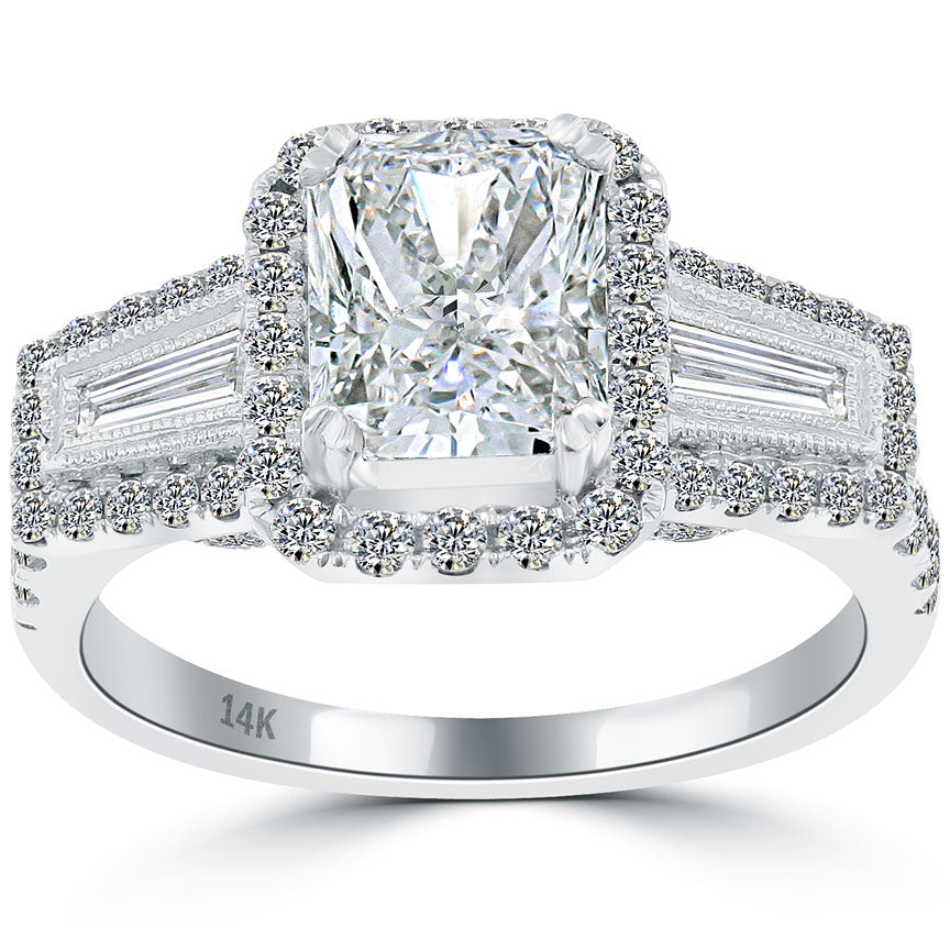 This sensational Diamond Engagement ring is set with a 2.02 ctw Radiant Cut center diamond. The side diamonds consist of both baguettes and round brilliants adding up to a total of 0.92 ctw F-VS micro pave diamonds. The Radiant Cut center stone is surrounded by a micro pave diamond halo. The baguettes are set on either side of the center diamond. Micro pave diamonds surround each baguette in a semi-hexagon. The band is lined up with a short row of round micro pave diamonds as well. This Vintage Style Diamond ring is made in 14kt white gold.
