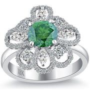 This huge fancy green round cut diamond engagement ring is perfectly set up with a 2.00ctw fancy Green diamond center stone and 0.99ctw of gorgeous round and marquis sides diamonds. This unique fancy green diamond engagement ring is complimented by small round as well as marquis diamonds on the halo. This unique diamond engagement ring is casted in 18kt white gold. The main stone shows imperfections under magnification as it is a SI1 in clarity. This is the perfect diamond engagement ring for your perfect bride.