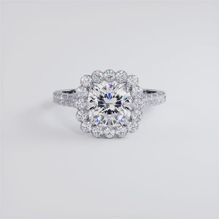 A beaded prong halo diamond engagement ring set with 100% natural earth mined diamond (not treated or enhanced in any way).
