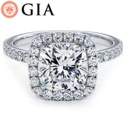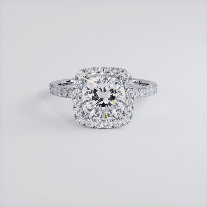A high set squarish halo engagement ring set with 2.00 Carat Cushion Cut Lab Grown Diamond.