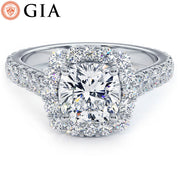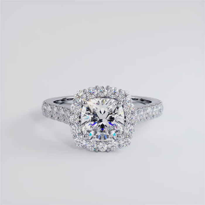 A vintage style micro prong set halo diamond engagement ring set with 1.5 Carat Cushion Cut Lab Grown Diamond.