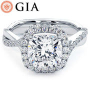 A petite diamond halo infinity twist engagement ring set with 2.00 Carat Cushion Cut Lab Grown Diamond.