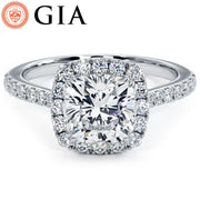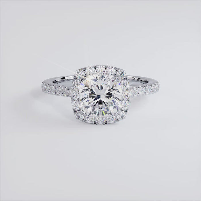 A micropavé halo engagement ring set with 2.00 Carat Cushion Cut Lab Grown Diamond.