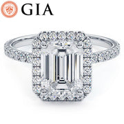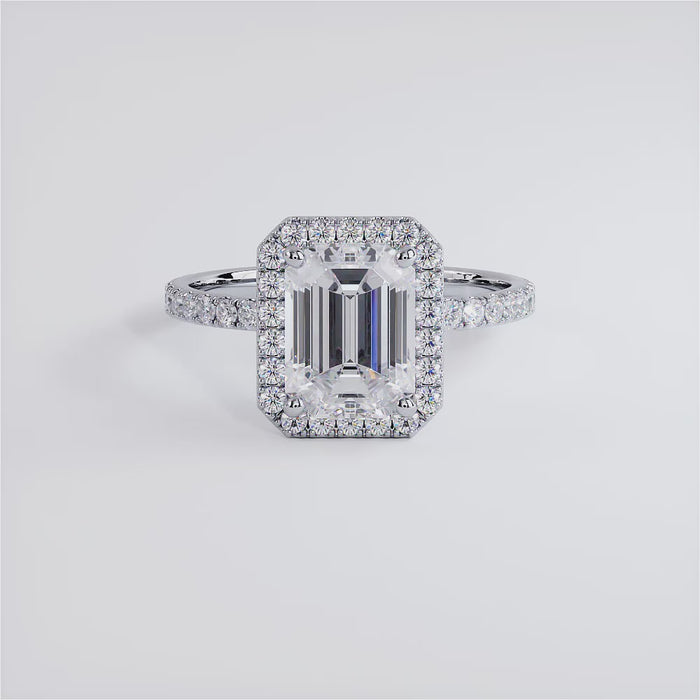 A classic petite diamond halo engagement ring set with 2.00 Carat Emerald Cut Lab Grown Diamond.