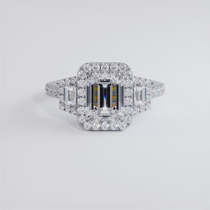 A three stone micropavé halo engagement ring set with 2.00 Carat Emerald Cut Lab Grown Diamond.