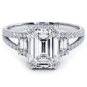 A three stone micropavé split shank diamond engagement ring set with 2.00ct DEW Emerald Cut Charles & Colvard Forever One™ Colorless (D-E-F) Moissanite.
