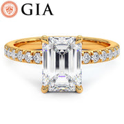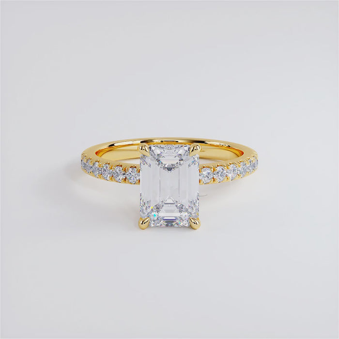 A classic diamond solitaire under halo engagement ring set with 2 Carat Emerald Cut Lab Grown Diamond.
