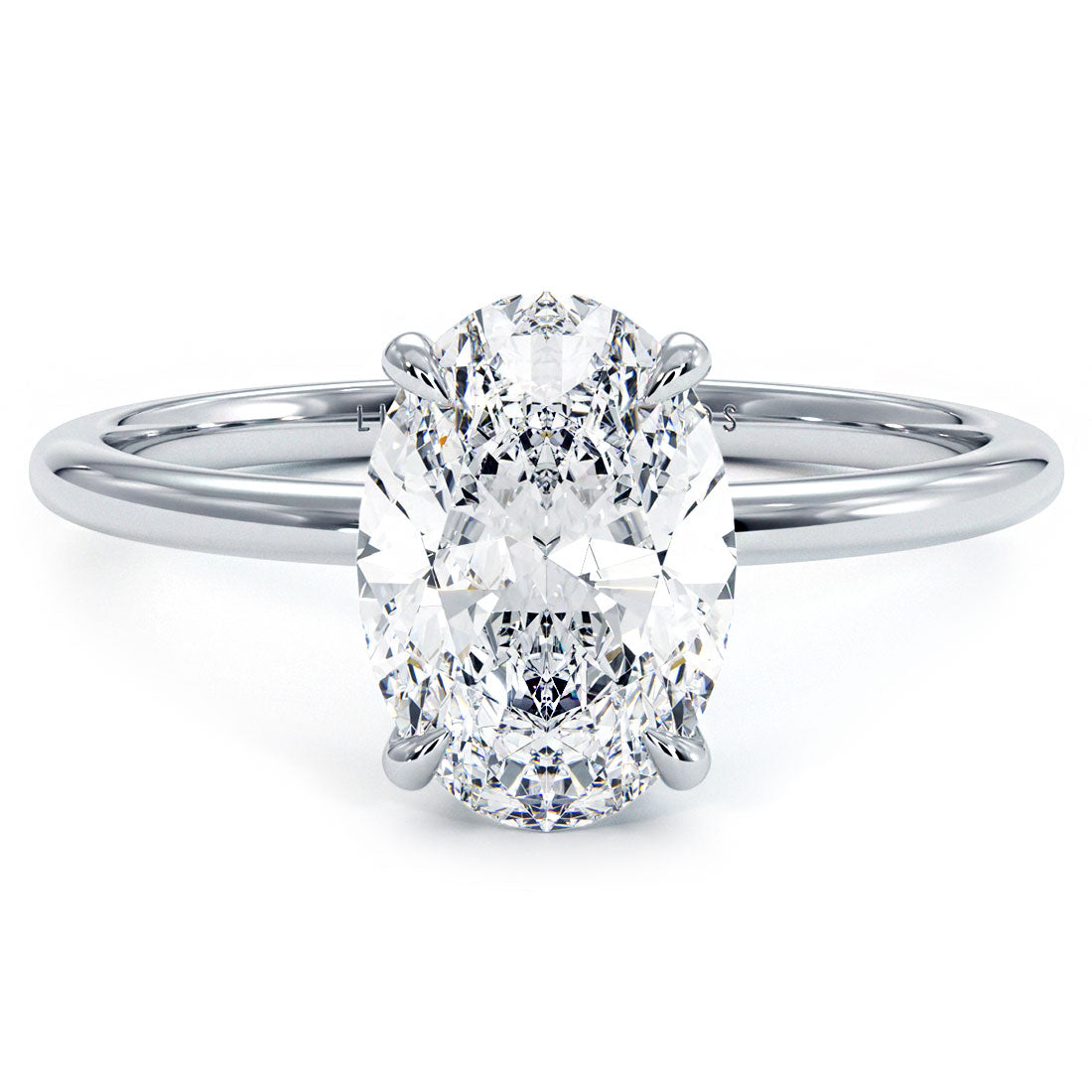 A classic petite wire basket diamond solitaire engagement ring set with 2 Carat Oval Cut Lab Grown Diamond.