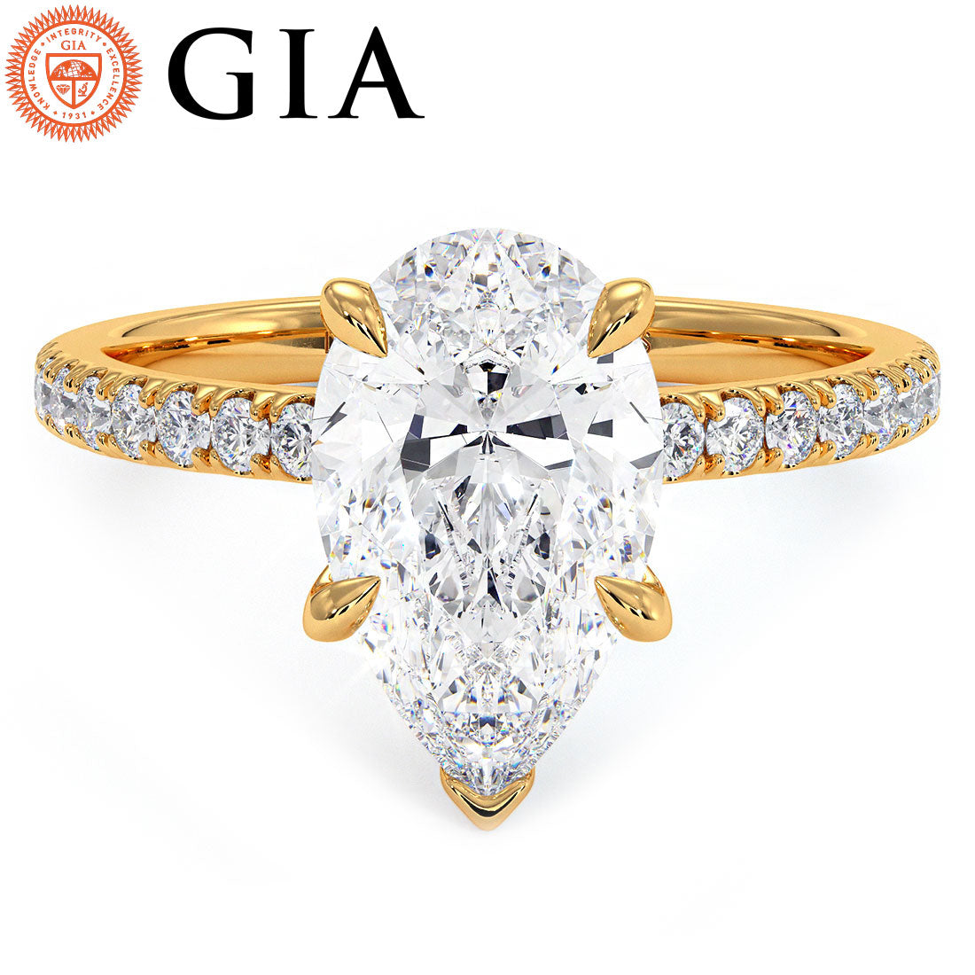 A classic petite micropavé diamond engagement ring set with 2 Carat Pear Shaped Lab Grown Diamond.