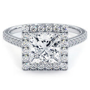 A square micropave halo diamond engagement ring set with 2.00ct dew Princess Cut VVS & Colorless (D-E-F) Moissanite.
