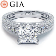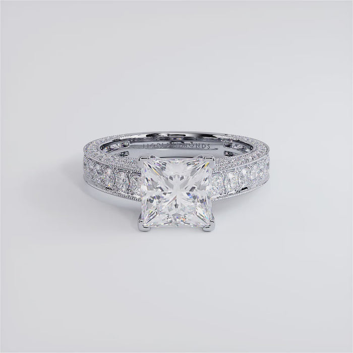 A micropavé milgrain diamond engagement ring set with 2.00 Carat Princess Cut Lab Grown Diamond.