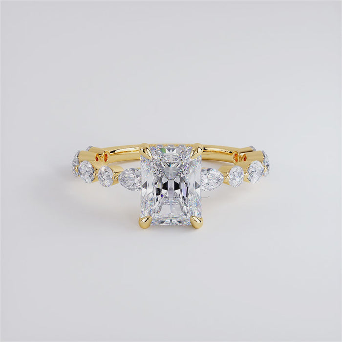 An alternating round & marquise diamonds engagement ring set with 2 carat Radiant cut lab grown diamond.
