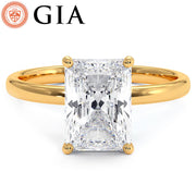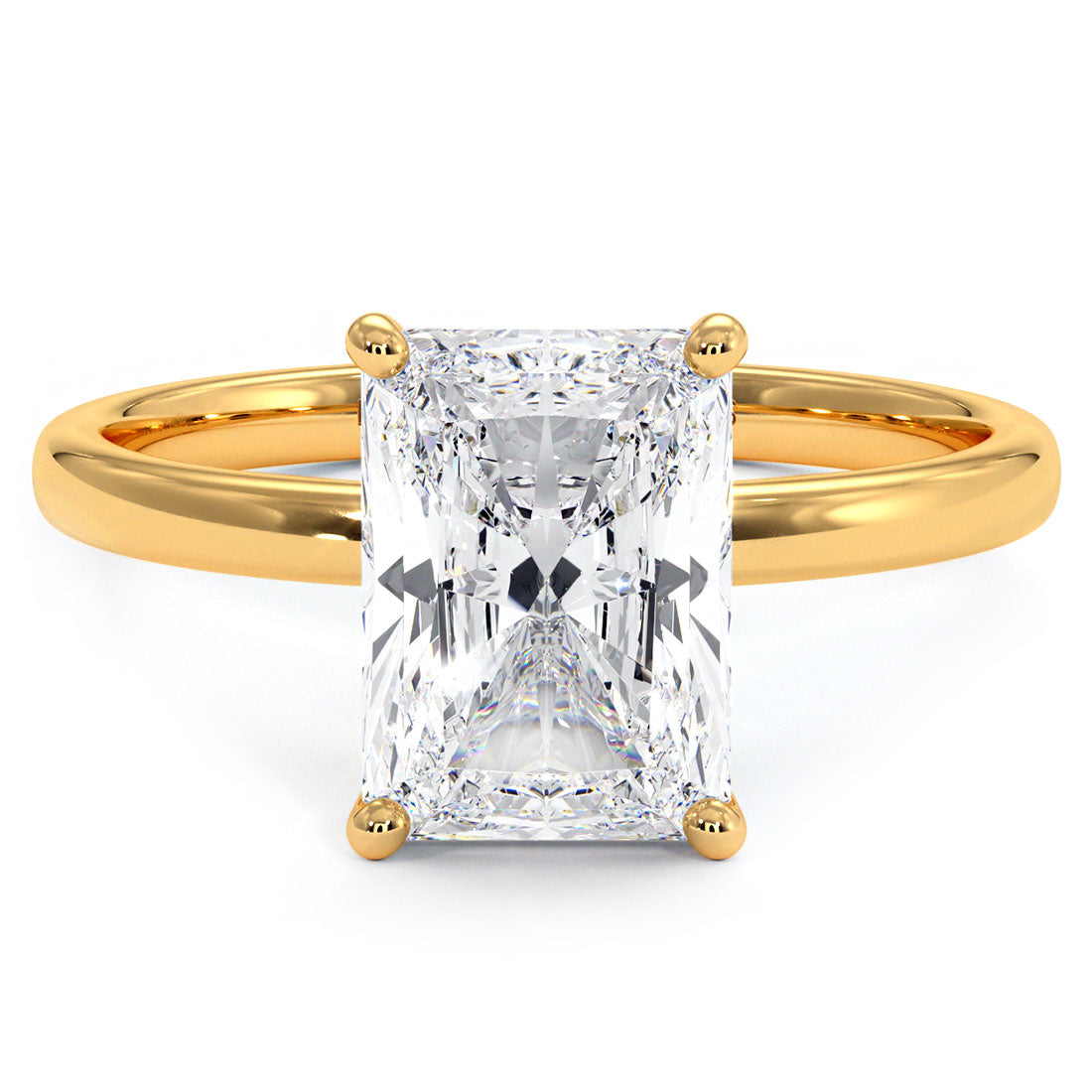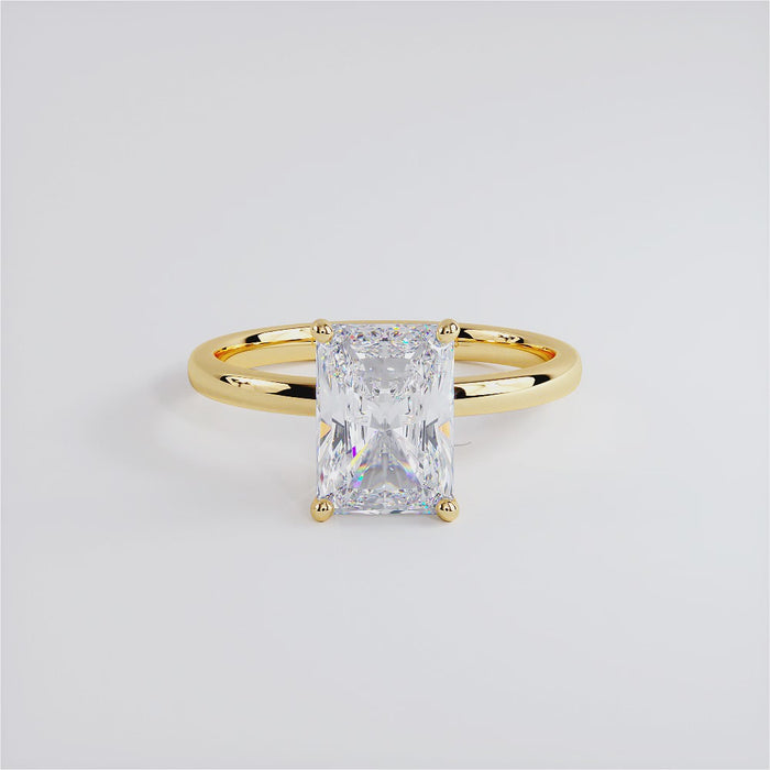 A classic petite wire diamond solitaire engagement ring set with 2 Carat Radiant Cut Lab Grown Diamond.