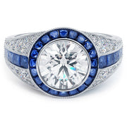 Hand made art deco special cut sapphire & diamond engagement ring set with 2.00ct DEW Round Cut Charles & Colvard Forever One™ Colorless (D-E-F) Moissanite.