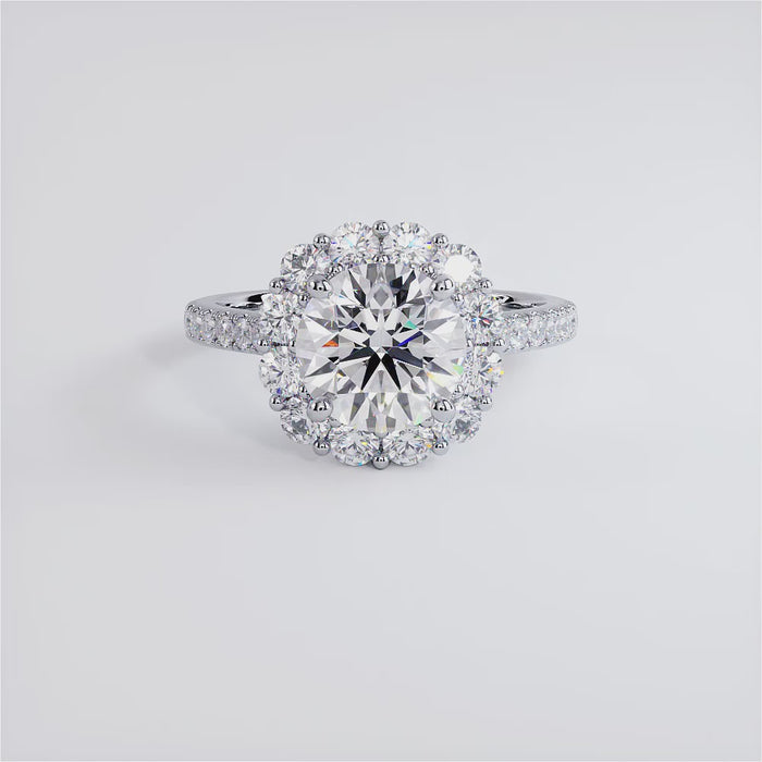 A unique floral halo diamond engagement ring set with 100% natural earth mined Diamond (not treated or enhanced in any way).