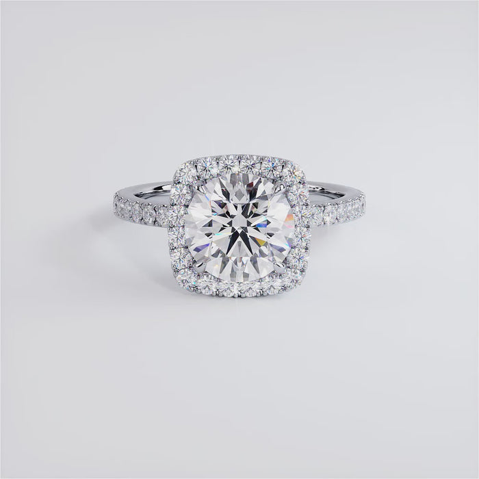 A high set squarish halo engagement ring set with 2.00 Carat Round Cut Lab Grown Diamond.