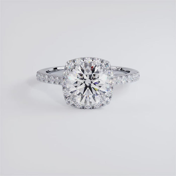 A micropavé halo engagement ring set with 2.00ct DEW Round Cut Charles & Colvard Forever One™ Colorless (D-E-F) Moissanite.