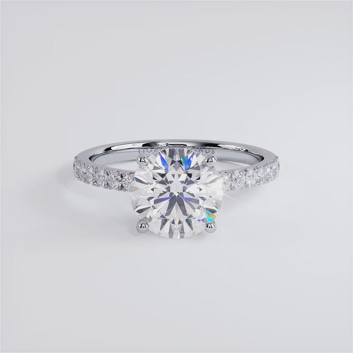 A petite French cut setting engagement ring set with 2.00 Carat Round Cut Lab Grown Diamond.