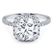 A petite squarish halo micropavé diamond engagement ring set with 2.00ct dew Round cut VVS & Colorless (D-E-F) Moissanite.