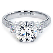 A three stone micropavé eagle prongs diamond engagement ring set with 2.00ct DEW Round Cut Charles & Colvard Forever One™ Colorless (D-E-F) Moissanite.