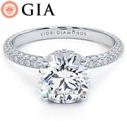 A classic under halo trio micropave diamond solitaire engagement ring set with 2.00 Carat Round Cut Lab Grown Diamond, securely held in place by four sturdy prongs.