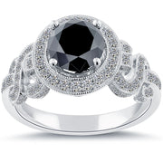 This stunning diamond engagement ring is beautifully set with a 2.00 ctw round brilliant cut fancy black center diamond. The side diamonds used in this mounting are all F-VS white round brilliant stones that are all set in micro pave setting. This ring is beautifully styled in a vintage design and is made in 18k white gold.