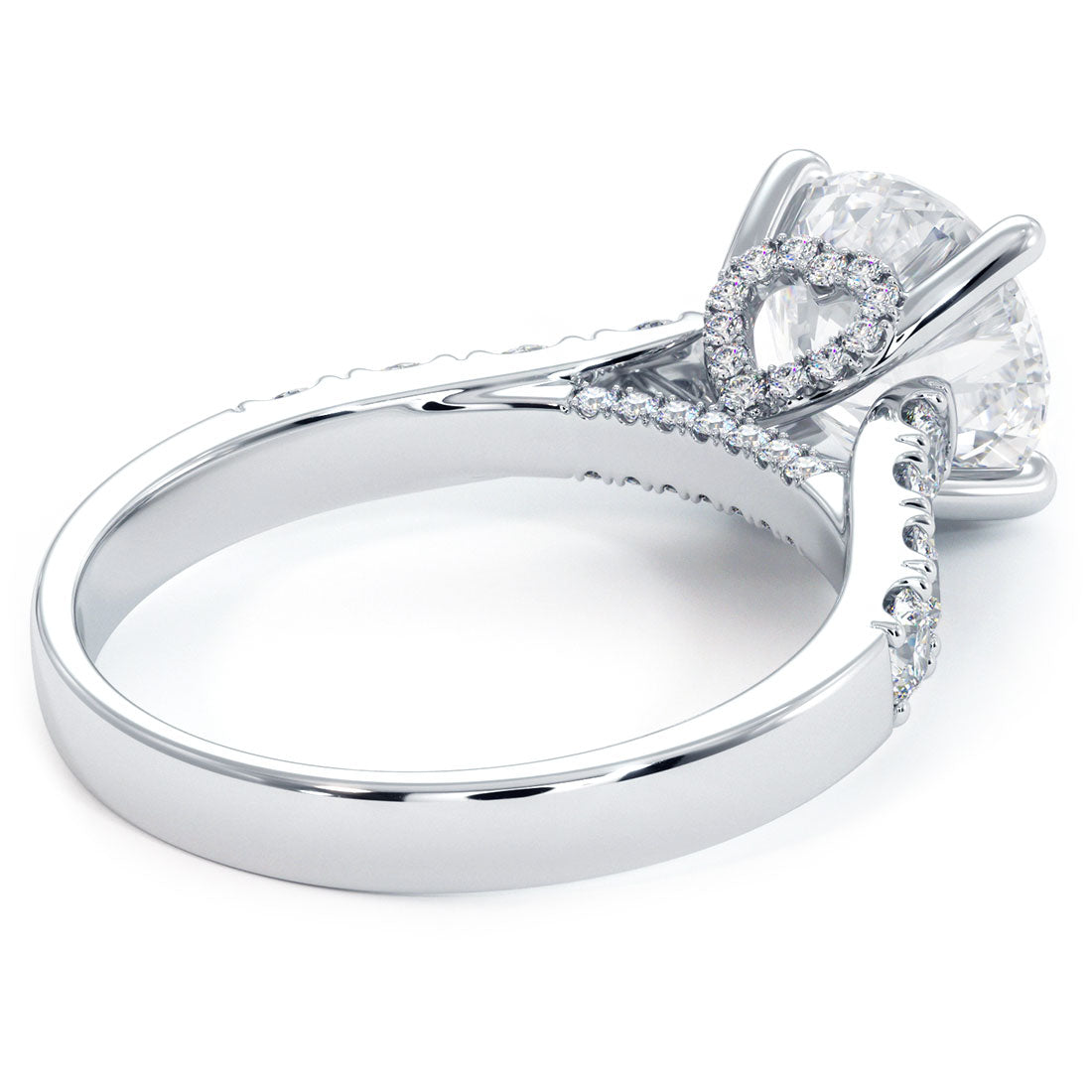 A cathedral heart shape gallery diamond engagement ring set with a 2 carat round cut lab Grown diamond.