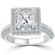This beautiful diamond engagement ring is elegant and classy and is set perfectly with a dazzling 2.02 ctw princess cut center diamond. 1.02 ctw of F-VS round brilliant side diamonds are set in a micro pave setting along the band and pave halo of the ring. This princess cut diamond engagement ring is made in 18k white gold.