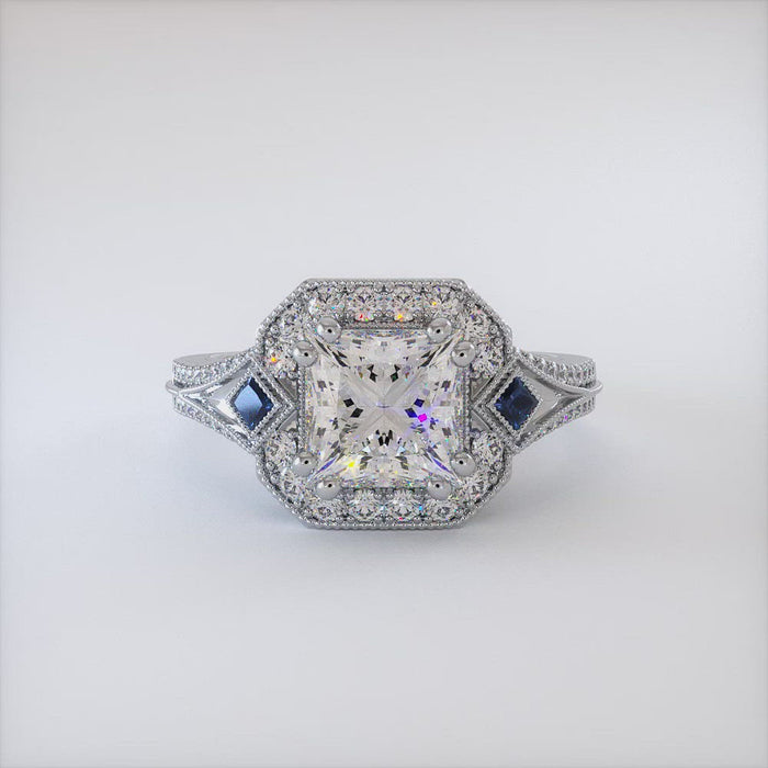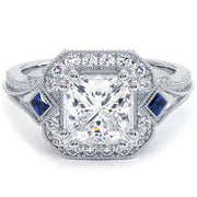This very unique diamond engagement ring is designed with beautiful vintage style detailing. The dazzling 2.05ctw princess cut center diamond is set elegantly in a prong setting. Two princess cut blue sapphire stones are set in a bezel setting on the face of this ring, one on either side of the center diamond. 1.05ctw of F-VS round brilliant diamonds are set in a micro pave setting along the band and around the center diamond. This magnificent princess cut diamond engagement ring is made in 14k white gold.