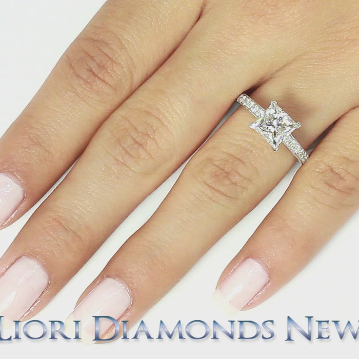 This classy and traditional diamond engagement ring is perfectly set with a 2.74ctw princess cut center diamond. 0.50ctw of F-VS round brilliant side diamonds are set along the elegant band of the ring, in a micro pave setting. The center diamond is secured in a prong setting. This princess cut diamond engagement ring is made in 18k white gold.
