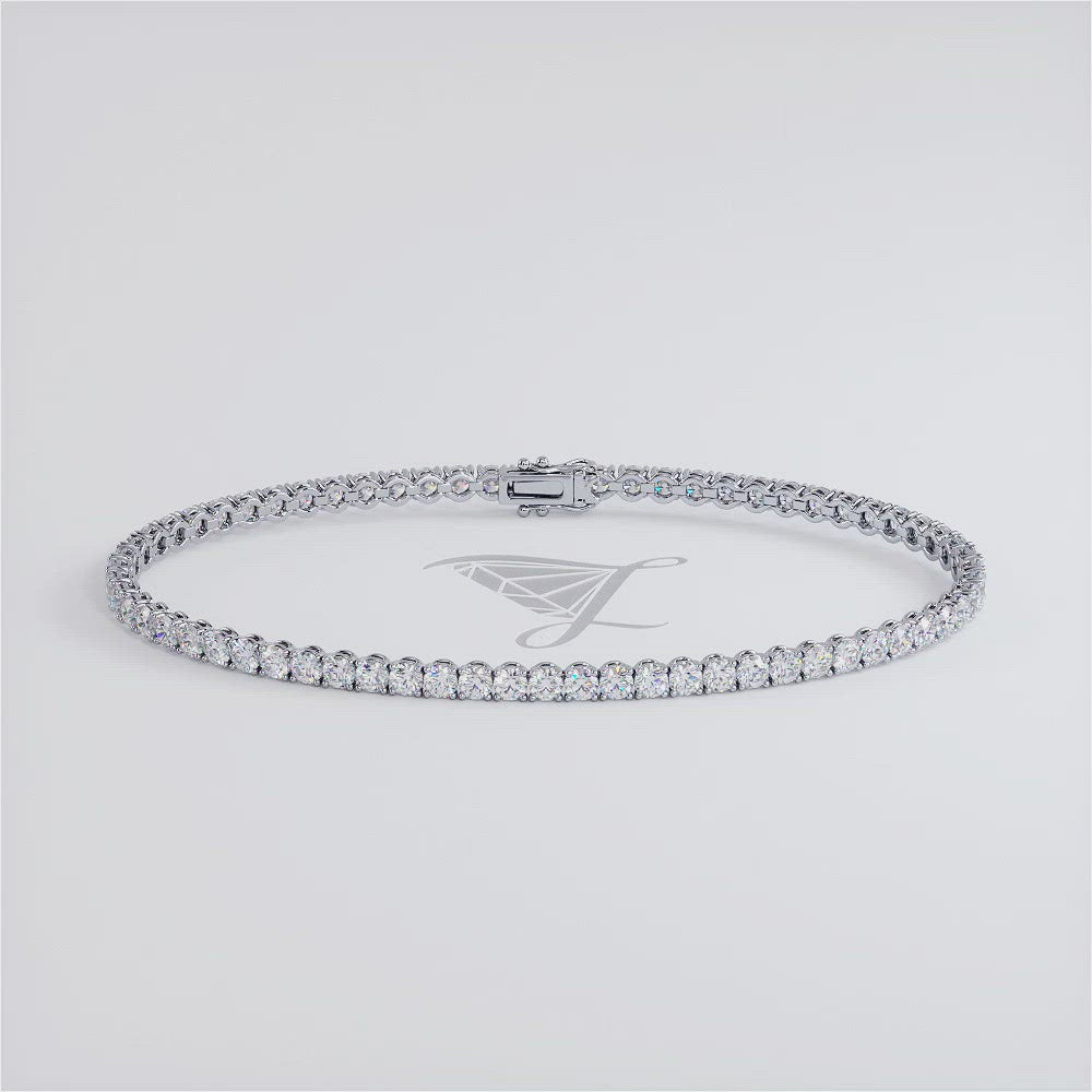 This single row prong set round brilliant cut diamond eternity bracelet is set with F color & VS1 clarity diamonds, every diamond is set beautifully and carefully in a 4 prong setting, the double securing clasp allows for worry and stress free wear. This diamond tennis bracelet is made in 14k White Gold.