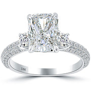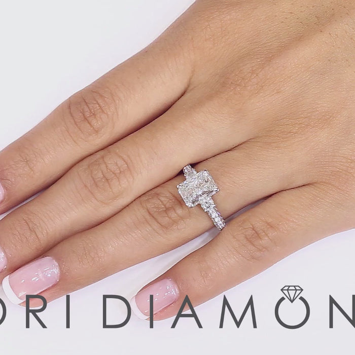 The 14k micro pave setting is outstandingly centered with a 2.40 ctw H-SI2 radiant diamond. The breathtaking center diamond is properly secured by 4 prongs. Accompanying the radiant diamond are a total of 1.07ctw round brilliant diamonds. The unique engagement ring is artistically crafted and ready to be worn!