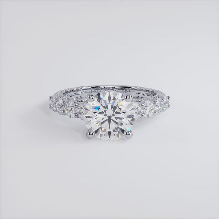 A unique micropavé & graduated side diamond engagement ring set with 2 carat round cut lab grown diamond.