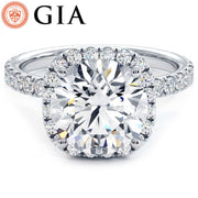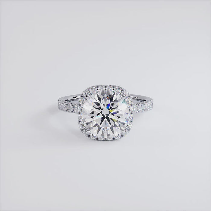 A petite squarish halo micropavé diamond engagement ring set with 3.50 Carat Round Cut Lab Grown Diamond.